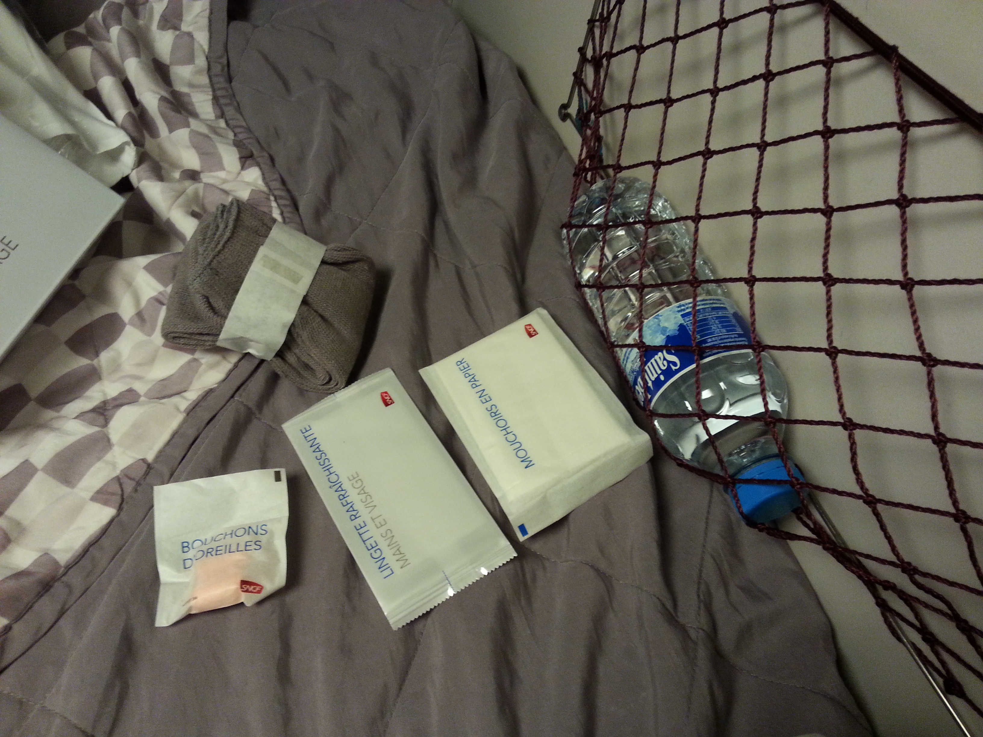 בשלב הזה היינו כבר רעבים, ולא נותר לנו דבר מהאוכל שהבאנו איתנו מישראל. שיטוט בין עסקי המזון בתחנה הראה לנו שכטבעונים אין לנו שום דבר שאנחנו יכולים לאכול. לבסוף ביקשנו מאישה שעבדה בחנות של כריכים להוציא לנו את הבשר והגבינה מהכריכים, כך שנותרו בהם ירקות וקטשופ. קנינו ממנה גם חטיפי צ’יפס (בסגנון תפוצ’יפס). התחלה רעה מבחינה קולינרית, שבשילוב העייפות הרבה תסכלה אותנו מאוד. לתסכול נוספה גם העובדה שלא היה היכן למלא מים בתחנה. התחרטנו שלא מילאנו את שקיות השתייה שלנו לאחר הצ’ק אין בנתב”ג (הן היו ריקות משיקולי משקל). לאחר שניסיון לקנות מים ממכונת שתייה נכשל והעלה עוד את רמת התסכול, נתקלנו באדיבות הצרפתית בשנית. דיילת שעבדה בתחנה הביאה לנו בקבוקי מים ולא הסכימה גם היא לקבל תשלום בעבורם.