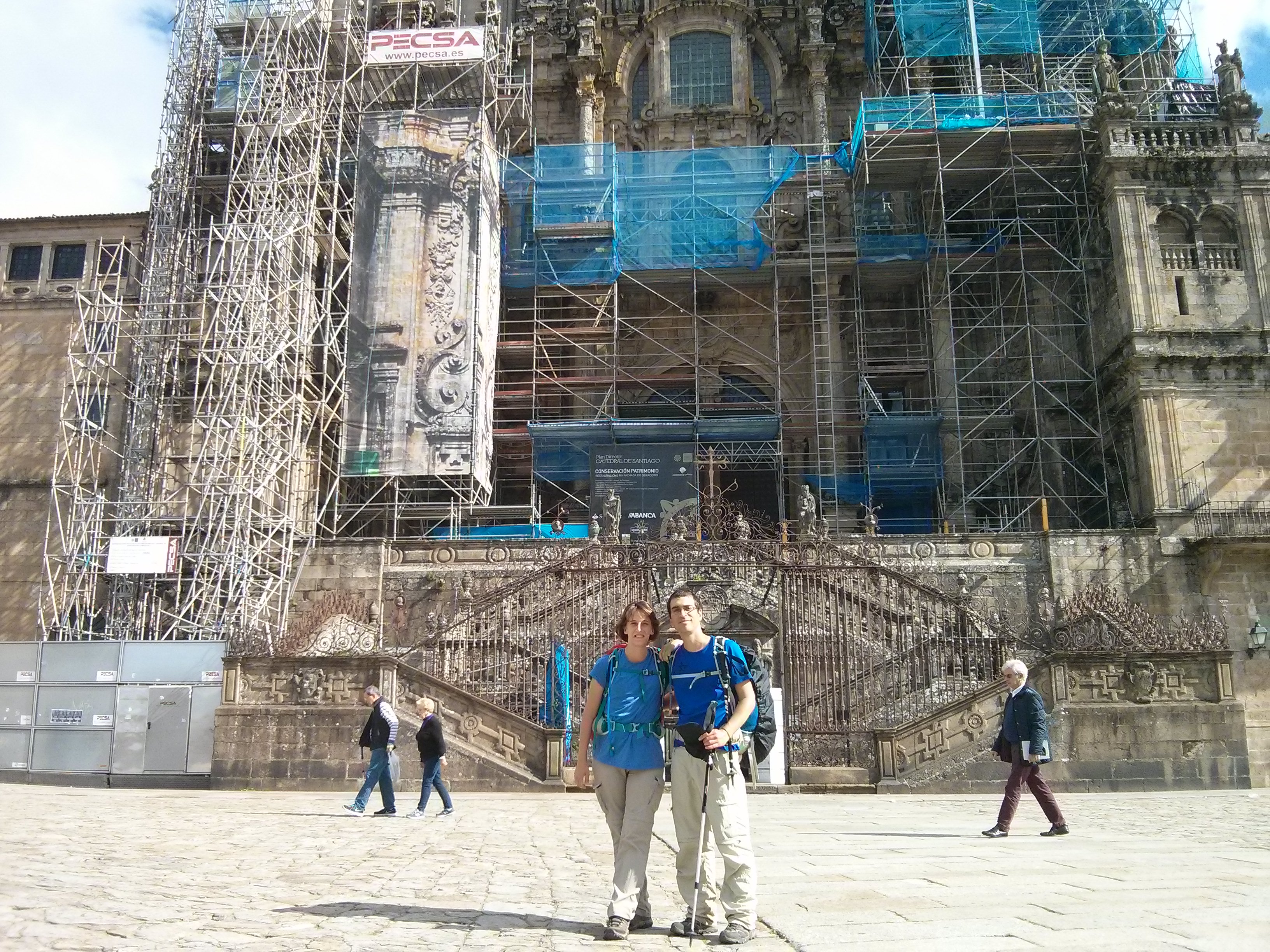 לאחר הליכה של כמה קילומטרים באזור העירוני של העיר נכנסנו לעיר העתיקה. עוד קצת הליכה, והנה אנחנו נשפכים ל-Plaza del Obradoiro, הכיכר הגדולה שבאחת הצלעות שלה ניצבת הקתדרלה, נקודת הסיום של ה-Camino de Santiago. במרכזה של הכיכר היו מרוכזים פרגרינוס עייפים שזה עתה סיימו את מסעם. הם פשוט ישבו על הרצפה ונהנו מהרגע. שמחנו לפגוש שם את חבורת הברזילאים שכבר פגשנו בעבר לאורך הדרך.