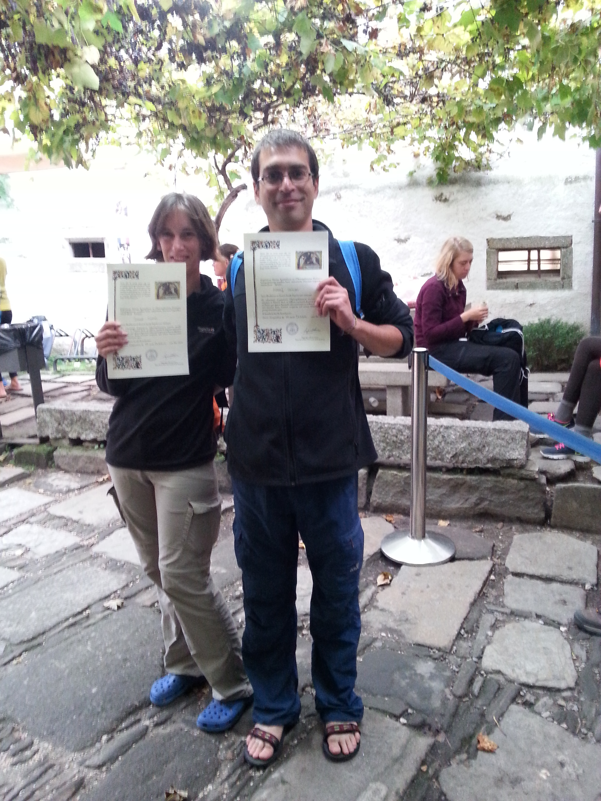 השלב הבא היה קבלת הקומפוסטלה. כשחלפנו על-פני משרד הצליינים (Oficina de Acogida al Peregrino ב-Rúa Carretas 33) בשעה 15:30 התור היה גדול. כשחזרנו ב-18:30 התור היה קטן בהרבה. כשמגיע תורכם ממלאים כמה פרטים בטופס ובהתאם למניע שהביא אתכם לעשות את המסע (דתי, דתי או רוחני, תרבותי או ספורטיבי) מקבלים תעודה שמאשרת שהלכתם בדרך סנטיאגו. כביכול הקומפוסטלה לא עולה כסף, אבל בפועל אומרים שזה שני יורו, ויש קופסה לתרומה שבו שמים את הכסף.